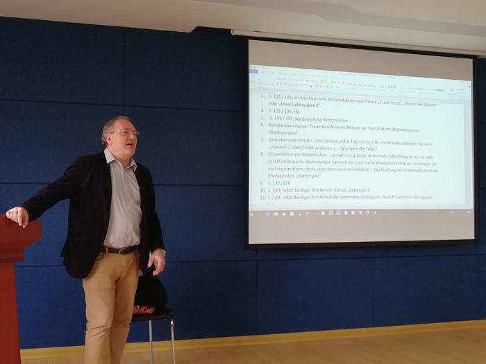 4日至7日,格里查先生就課堂組織的基本原理、課堂設計的基本模式、產出導向教學法、行動導向教學法、以及如何提高學生課堂參與度等為德語教師舉行了為期4天的教學法講座,并引導老師進行相關的課堂設計。
