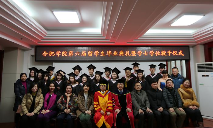 我校學位評定委員會委員、學位辦主任、副校長陳嘯宣讀合肥學院學位評定委員會“關于授予李栽星等十八位留學生學士學位的決定”,其中16人獲得文學學士學位、2人獲得工學學士學位。蔡敬民、陳嘯分別為18位留學生頒發(fā)畢業(yè)證書、學位證書和撥流蘇、合影。
