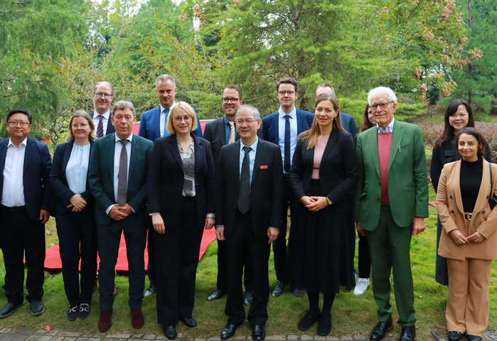 在中德友誼林,卡塔琳娜·普特市長與校領(lǐng)導手握鐵鍬,合力為這株象征中德友誼的松柏培土、澆水。植樹活動完成后,雙方握手并合影留念。