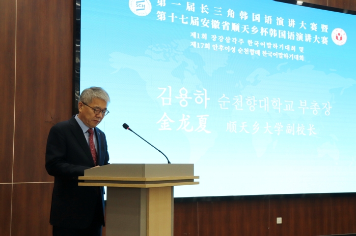 金龍夏對參賽的師生表示歡迎,對安徽省教育廳、合肥大學的支持表示感謝。他介紹了順天鄉大學的教育理念、辦學成就以及國際合作情況,強調此次大賽是兩校合作及中韓文化交流的重要平臺,參賽者在此過程中的相互學習與分享將收獲更多價值。