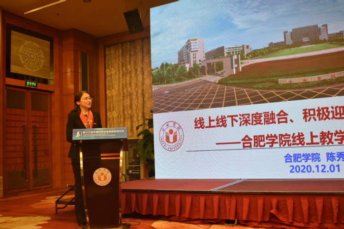 陳秀以《線上線下有機融合、積極迎接“新教育形態”:合肥學院線上教學的實踐與探索》為題作報告。她從新時代中國高等教育發展面臨新形態、疫情期間合肥學院線上教學實踐回顧、未來探索線上線下深度融合的新思路這三個方面作了詳細匯報。陳秀提到“金課”和“一流課程”兩個關鍵詞,展示了疫情防控背景下在線教育教學的工作思路,總結了疫情期間合肥學院線上教學六大創新做法。