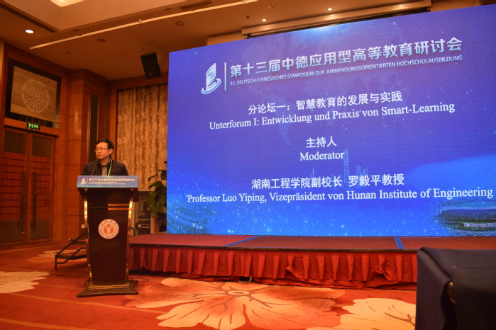 第一分論壇主題為智慧教育的發展與實踐,由湖南工程學院副校長羅毅平教授擔任主持人。北京大學教授陳洪捷,薩克森職業學院校長、德累斯頓學院院長安德烈亞斯·漢塞爾教授,合肥學院副校長陳秀,奧斯納布呂克應用科學大學教授亨德里克·拉克勒進行專題報告。