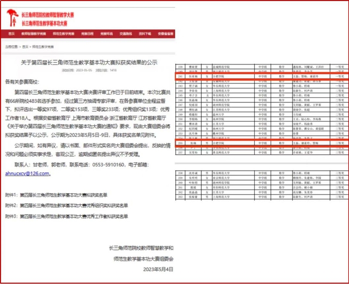 5月6日,由安徽省教育廳、上海市教育委員會(huì)、浙江省教育廳、江蘇省教育廳主辦的第四屆長(zhǎng)三角師范生教學(xué)基本功大賽決賽擬獲獎(jiǎng)名單公示。我校20級(jí)數(shù)學(xué)與應(yīng)用數(shù)學(xué)專業(yè)伍亞楠和張瑞同學(xué)在與來自華東師范大學(xué)、浙江師范大學(xué)的優(yōu)秀學(xué)子的同場(chǎng)競(jìng)技中發(fā)揮出色,分獲一等獎(jiǎng)和三等獎(jiǎng)。據(jù)悉,在此前進(jìn)行的安徽省師范生教學(xué)技能競(jìng)賽中,伍亞楠和張瑞雙雙獲得一等獎(jiǎng)并入選中學(xué)數(shù)學(xué)組“省隊(duì)”,代表安徽省參加了此次長(zhǎng)三角師范生教學(xué)基本功大賽。此外,在4月16日進(jìn)行的“田家炳杯”第八屆全國(guó)師范院校師范生教學(xué)技能競(jìng)賽決賽中,20級(jí)數(shù)學(xué)與應(yīng)用數(shù)學(xué)專業(yè)吳倩同學(xué)獲得二等獎(jiǎng),這是數(shù)學(xué)與應(yīng)用數(shù)學(xué)(師范)專業(yè)連續(xù)三年進(jìn)入決賽并獲得二等獎(jiǎng)。