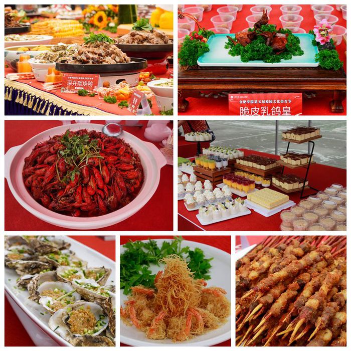 脆皮乳鴿皇,椒鹽排骨,香酥雞中翅,避風塘烤排,水煮牛柳,特色燒龍蝦……一排排整齊的美食車擺滿了色香味俱全的各類菜肴,校內各家餐飲公司紛紛拿出自家絕活,各色美食精彩呈現,廣場上食物飄香,讓人垂涎欲滴。師生們三五成群,在各個美食攤點前駐足流連,排隊品嘗豐盛美味的食物?,F場人頭攢動,每個人臉上都洋溢著快樂的笑容。