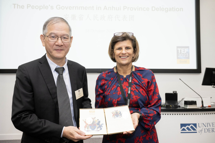 10月18日,在王清憲、唐銳、托尼·金及安徽省政府代表團的見證下,王其東代表學校與德比大學校長凱西·米切爾(Kathryn Mitchell)簽署了校際合作框架協議,開展師生互訪、學生培養、科研合作等。
