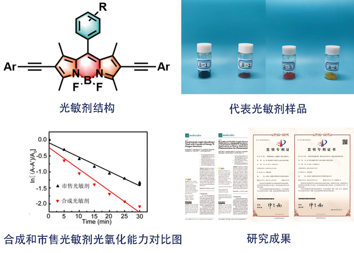 三重態(tài)光敏劑在光伏電池、光動(dòng)力學(xué)療法等領(lǐng)域具有廣泛的應(yīng)用,是實(shí)現(xiàn)國(guó)家“十四五”亟待解決的難題“腔內(nèi)腫瘤高效靶向光動(dòng)力治療方法”的核心。該項(xiàng)目針對(duì)傳統(tǒng)光敏劑的缺點(diǎn)和發(fā)展新型光敏劑的瓶頸問(wèn)題,提出利用化學(xué)合成手段,調(diào)整氟硼熒的共軛結(jié)構(gòu)以及引入自旋轉(zhuǎn)換單元,合成了系列具有穩(wěn)定系間竄越能力、在可見(jiàn)-近紅外光區(qū)具有較強(qiáng)光捕獲能力、較長(zhǎng)三重激發(fā)態(tài)壽命和較高單線態(tài)氧量子產(chǎn)率的光敏劑。基于此項(xiàng)目,共獲授權(quán)發(fā)明專(zhuān)利2項(xiàng)、發(fā)表SCI收錄論文2篇、簽訂企業(yè)委托研發(fā)項(xiàng)目1項(xiàng)。