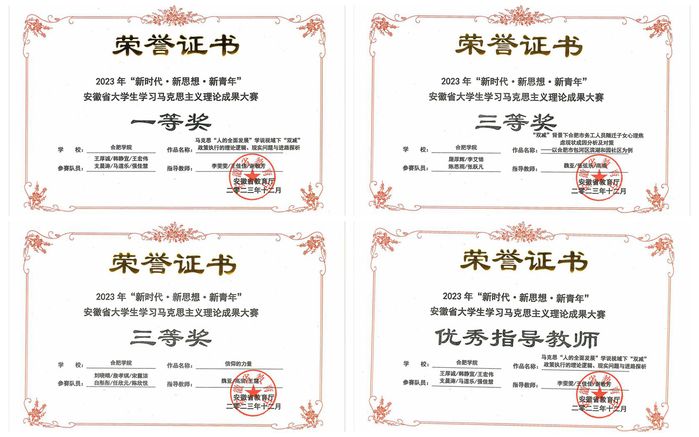 日前,由安徽省教育廳主辦的2023年“新時代?新思想?新青年”安徽省大學生學習馬克思主義理論成果大賽圓滿落下帷幕,評審結(jié)果已在安徽省教育廳網(wǎng)站公布。本次比賽是我省馬克思主義理論學科唯一的大學生學科與技能競賽,我校馬克思主義學院連續(xù)四年組織學生參賽,本次選送的作品榮獲一等獎1項、三等獎2項。
