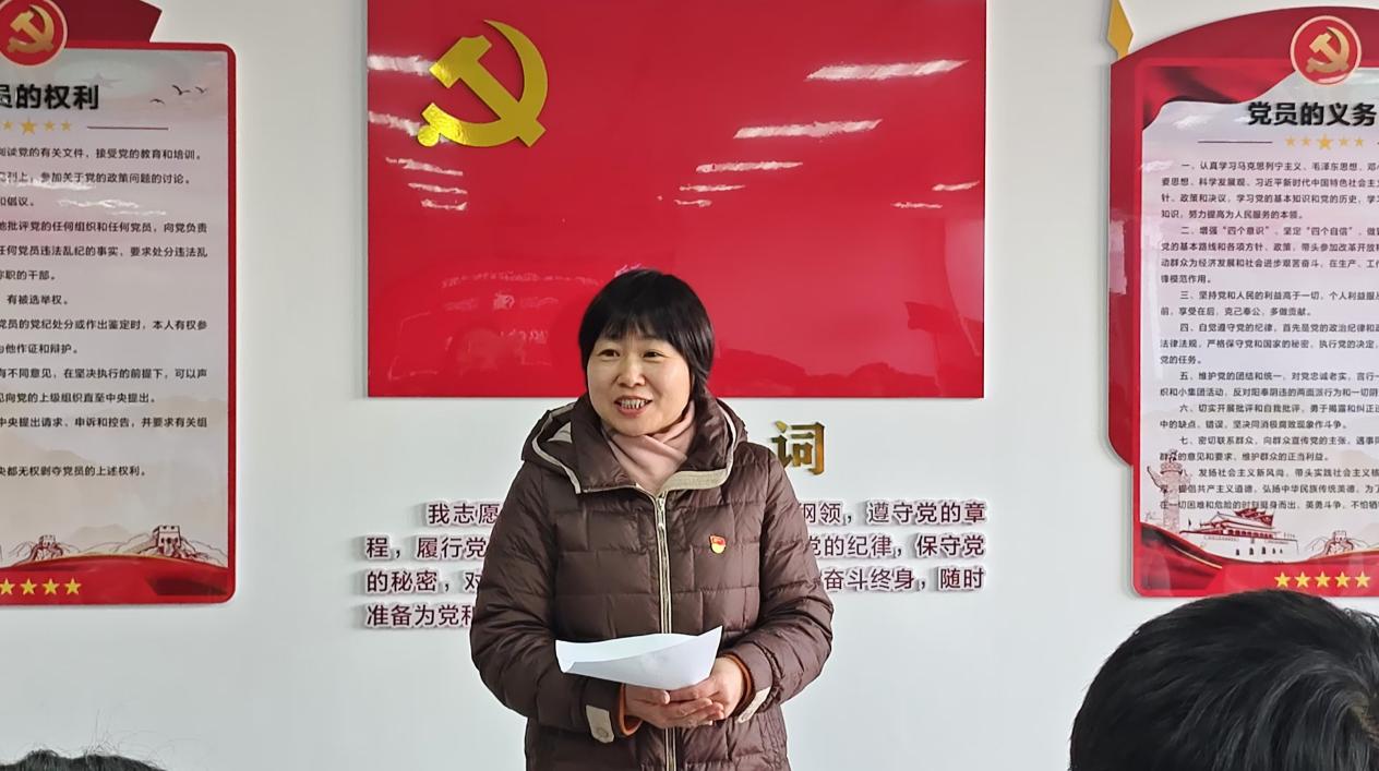 王璐代表新發(fā)展黨員發(fā)言,她表示要堅(jiān)定理想信念,加強(qiáng)政治理論學(xué)習(xí),刻苦學(xué)習(xí),充分發(fā)揮黨員先鋒模范作用。隨后,各學(xué)生黨支部書記為新黨員佩戴黨徽。在教師黨員汪自旺老師的領(lǐng)誓下,在場(chǎng)黨員面向黨旗進(jìn)行了莊嚴(yán)宣誓,表達(dá)了對(duì)黨的忠誠(chéng)和對(duì)共產(chǎn)主義的信仰。