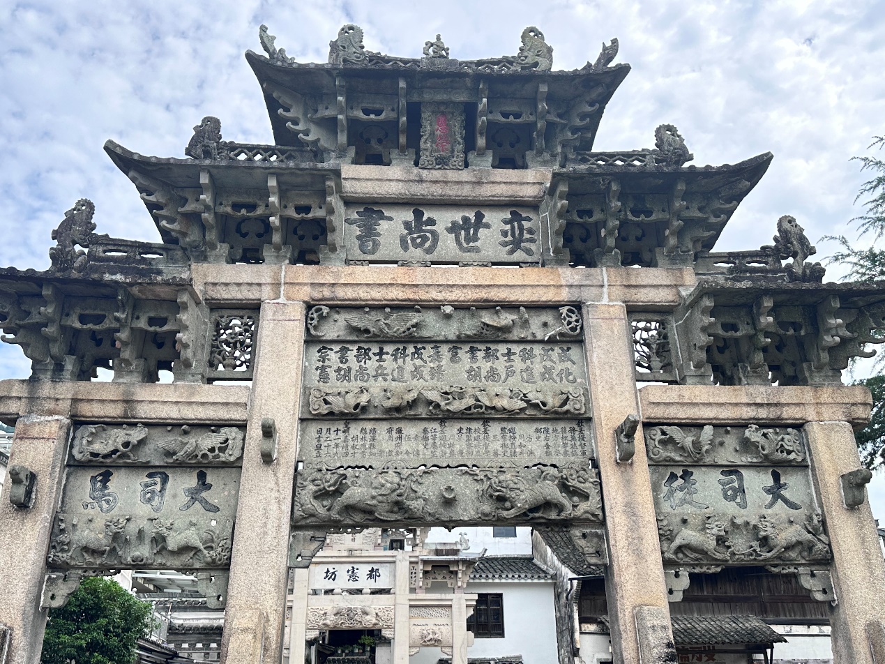 團(tuán)隊(duì)成員首先參觀了龍川村的標(biāo)志性建筑——奕世尚書坊。在講解員的講述下,隊(duì)員們對這座明代石牌坊的歷史背景、建筑特色和文化內(nèi)涵有了更加深入的了解。其精巧的浮雕、鏤刻和圓雕的雕刻手法,“恩榮”匾地位之崇高,以及與之呼應(yīng)的另一塊“圣旨”匾無一不體現(xiàn)出龍川歷史地位之高,人文之雄厚。奕世尚書坊不僅展示了古代工匠的精湛技藝,也是胡氏家族輝煌歷史的象征。