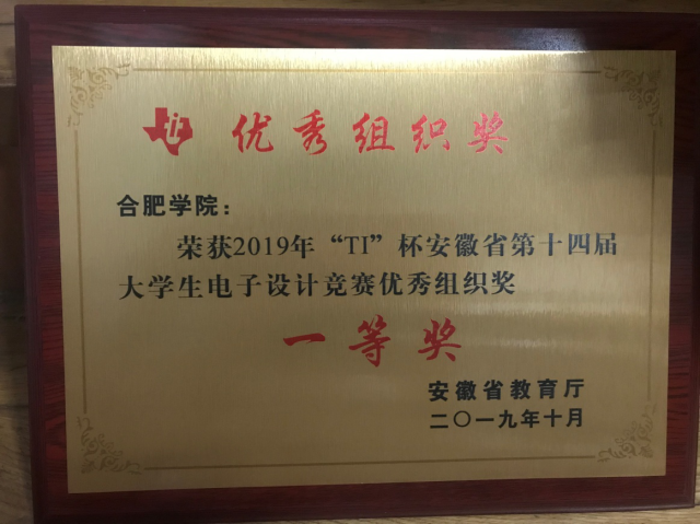 合肥學(xué)院榮獲2019年“TI”杯安徽省第十四屆大學(xué)生電子設(shè)計(jì)競(jìng)賽優(yōu)秀組織獎(jiǎng)一等獎(jiǎng),參賽學(xué)生榮獲安徽省一等獎(jiǎng)4項(xiàng),二等獎(jiǎng)1項(xiàng),三等獎(jiǎng)5項(xiàng)。(先進(jìn)制造工程學(xué)院李翠花