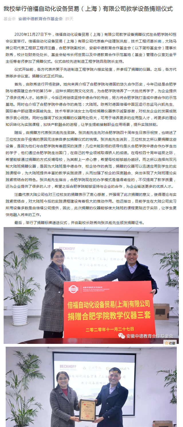 我校舉辦倍福自動化貿易(上海)有限公司教學設備捐贈儀式