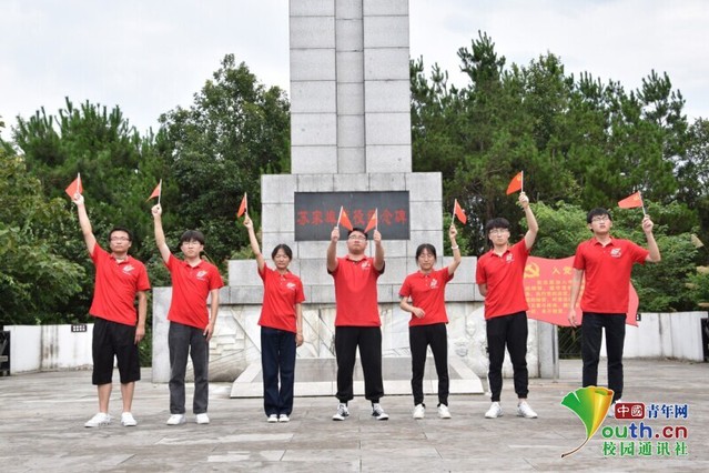 圖為調研團隊成員在紀念碑前揮旗致意。中國青年網通訊員 譚浩 攝??????