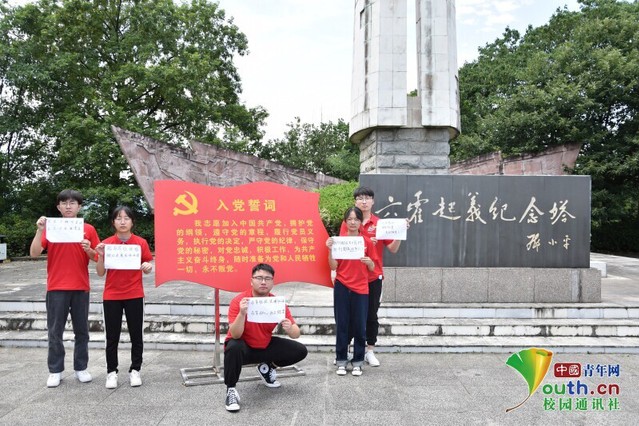 圖為調研團隊在六霍起義紀念塔下手持建黨一百周年祝福語合影留念。中國青年網通訊員 譚浩 攝??????
