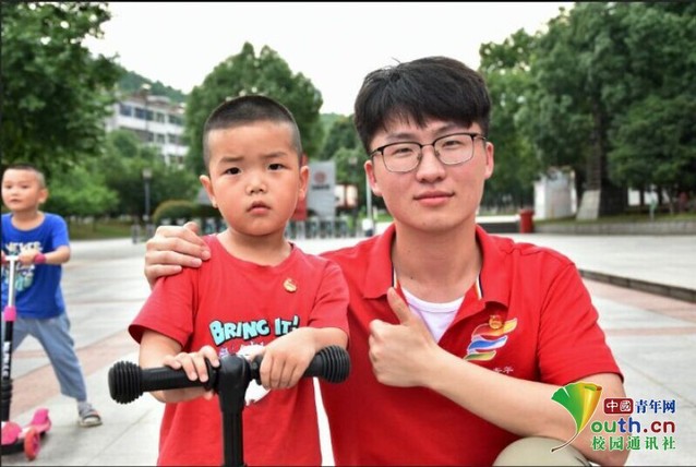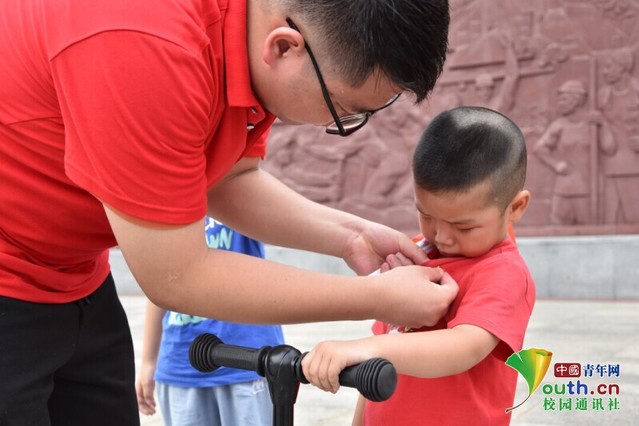 圖為調研團隊成員為紅軍廣場的孩子佩戴團徽。中國青年網通訊員 譚浩 攝