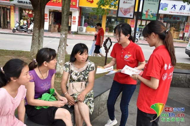 圖為調研團隊成員為勝利廣場居民派發宣傳冊。中國青年網通訊員 譚浩 攝