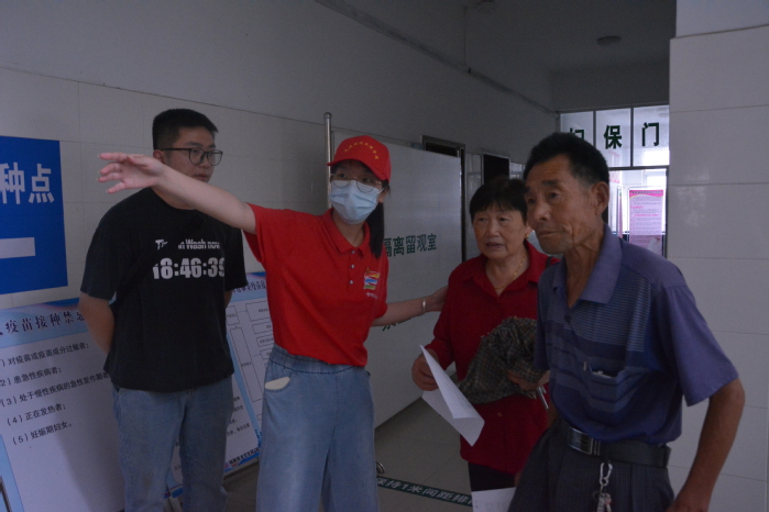 到達(dá)柿樹崗鄉(xiāng)之后,調(diào)研團(tuán)隊(duì)面對(duì)蚊蟲叮咬、天氣炎熱和較為艱苦的住宿環(huán)境沒有表現(xiàn)出畏難情緒,而是即刻參與到當(dāng)?shù)蒯t(yī)療衛(wèi)生工作之中。大家前往當(dāng)?shù)匦l(wèi)生院,協(xié)助醫(yī)護(hù)人員完成疫苗接種工作,幫助維護(hù)現(xiàn)場(chǎng)秩序,同時(shí)也為當(dāng)?shù)厝嗣衿占盎A(chǔ)醫(yī)療知識(shí),解答關(guān)于疫苗接種問題,消除未接種居民心中的疑惑與擔(dān)憂。