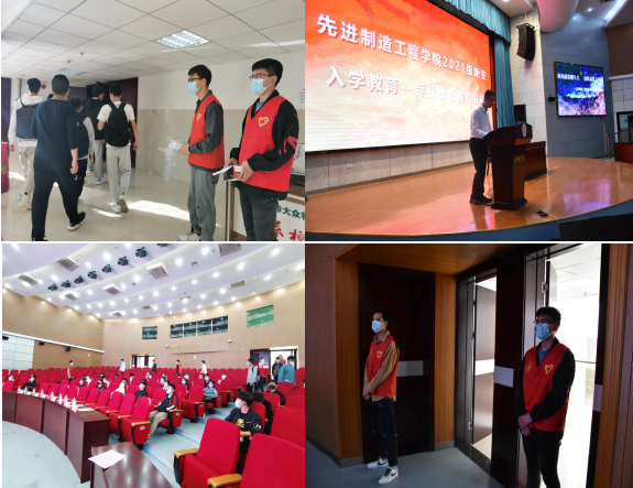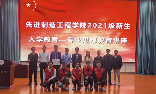 本次活動中,由黃榮升同學引導李新利專家前往報告廳就坐、伍中舉和劉偉成在圖書館報告廳A入口分發口罩、威力旺老師負責主持本次新生入學教育講座、張標和黃榮升引導21級新生間隔就坐并維持會場秩序、趙陽進行會場前期布置和多媒體調試工作。活動結束后,機制學生黨支部引導新生有序離場,并清理會場。校友專家和學院領導對機制學生黨支部同學的志愿服務工作給予積極贊揚,并進行了合影留戀。