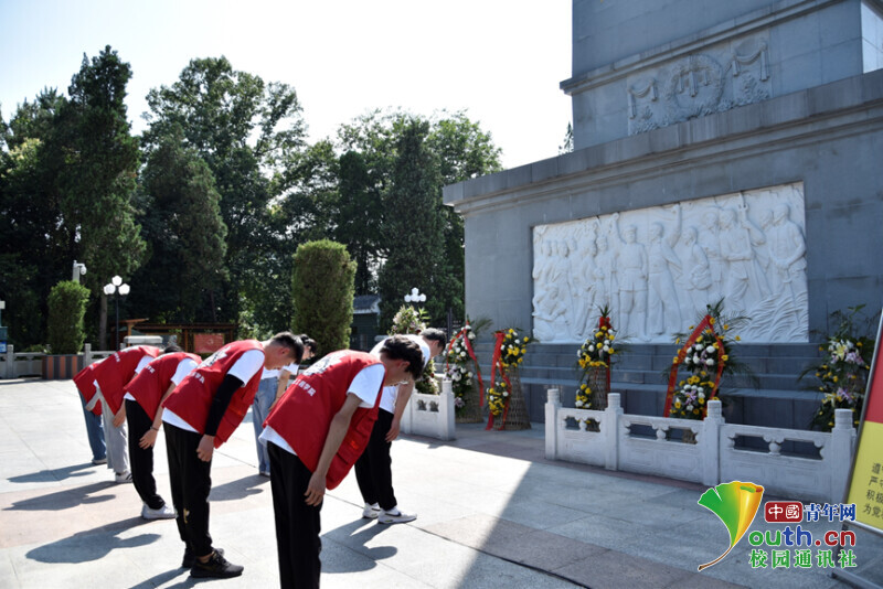 圖為調研團隊成員在金寨革命烈士陵園的革命烈士紀念塔前瞻仰悼念。中國青年網通訊員 江晨陽 攝