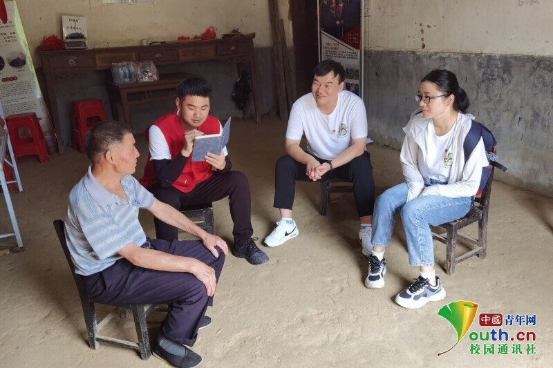 圖為調研團隊成員在花石鄉大灣村采訪大灣村“主動要求脫貧第一人”陳澤申。中國青年網通訊員 江晨陽 攝