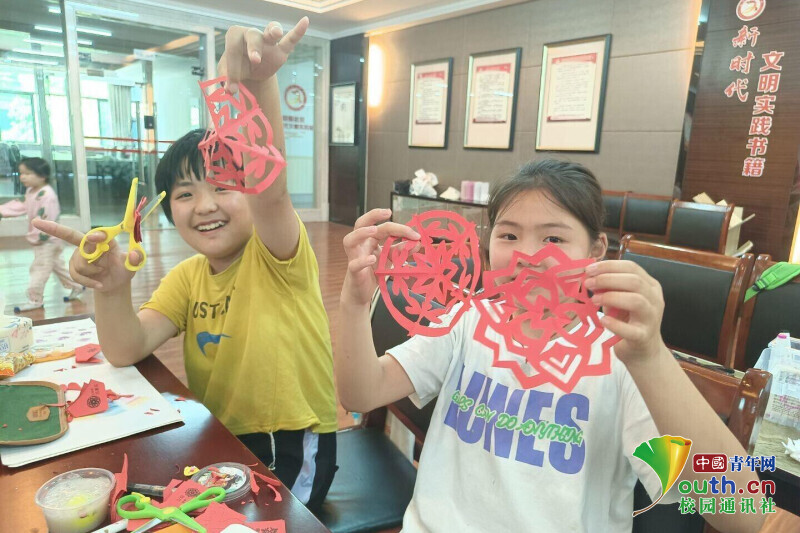 圖為剪紙課上小朋友們高興地向志愿者展示自己的作品。 中國青年網通訊員 章俊 攝