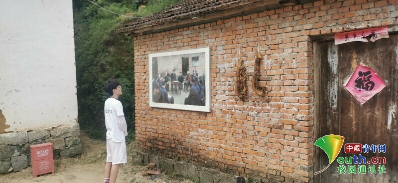 圖為調研成員在村民陳澤申家的小院,參觀總書記到訪金寨的照片 中國青年網通訊員 陳鑫 攝