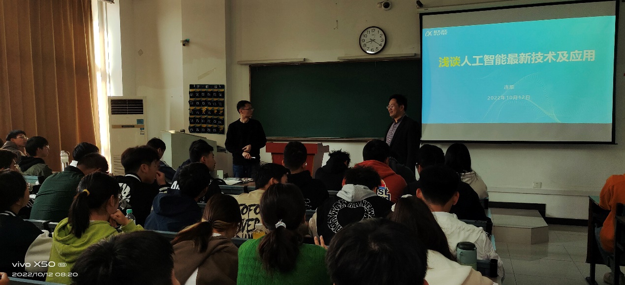 10月12日,科大訊飛教學(xué)產(chǎn)品部總監(jiān)連順高級(jí)工程師做了《淺談人工智能最新技術(shù)及應(yīng)用》的專題報(bào)告,首先對(duì)人工智能相關(guān)技術(shù)及應(yīng)用進(jìn)行了深入淺出的介紹,向?qū)W生展示了目前最新AI研究成果,然后介紹了企業(yè)人才需求,最后對(duì)同學(xué)們四年的大學(xué)生活提出了寶貴建議。