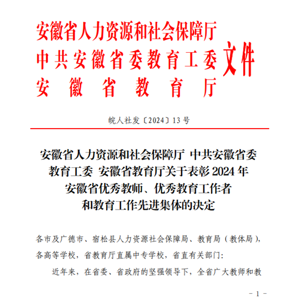 近日,安徽省人力資源和社會保障廳、中共安徽省委教育工委、安徽省教育廳發布了《關于表彰2024年安徽省優秀教師、優秀教育工作者和教育工作先進集體的決定》文件,我校先進制造工程學院獲評安徽省教育工作先進集體榮譽稱號。