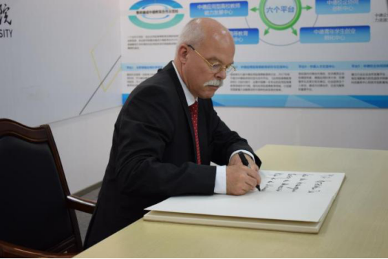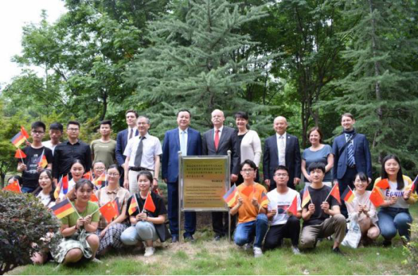 Ambassador Goetze expresses his thanks to HFU for its contribution to Sino-German cultural exchange and educational as well as technological cooperation. Afterwards, Dr. Goetze, Chair Cai and President Wang jointly plant a tree as a symbol of friendship on HFU campus.