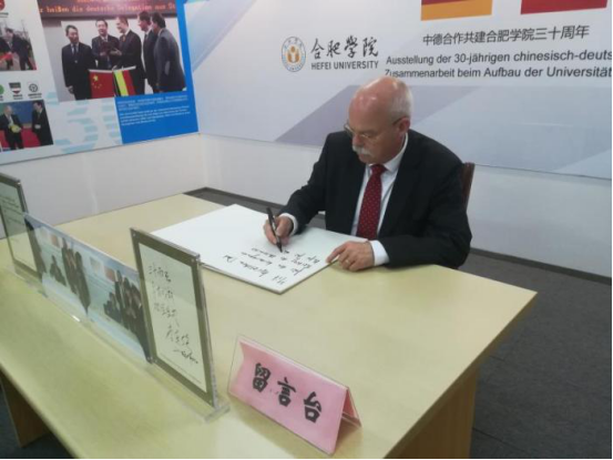 The two parties visit HFU’s Sino-German Cooperation Achievement Exhibition. Chair Cai states that HFU is a local undergraduate university born in the Reform, growing in the Opening-up and developing in innovation, which has proposed its school-running orientation of “locality, application and internationalization” ever since 2003. Learning from the German universities of applied sciences, HFU not only promotes its own development, but also plays a leading role in the transformation and development among domestic local universities.