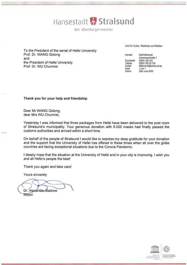 On behalf of the municipal government, Alexander Badrow, Mayor of Stralsund, expresses his heartfelt thanks in his letter to Dr. Wang Qidong, Chair of HFU Council and Dr. Wu Chunmei, HFU President, for HFU’s donation of 6000 medical masks.
