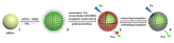 In this paper, it is mentioned that the synthesized SiO2@MIPs forms a microsensor array on the regular dot array of etched silicon wafers by self-assembled technique, and four heavy metal ions, whose LOD concentration is 10?9 mol·L?1, enter the nanostructured shell-layer with fluorescence-tagged recognition site driven by concentration differences. The recognition sites have highly selective recognition of heavy metal ions with sensitive responses. Based on FRET principle, ultra-trace detection of the target analytes can be achieved, which solves the problem of identification and detection of polymetallic ions.