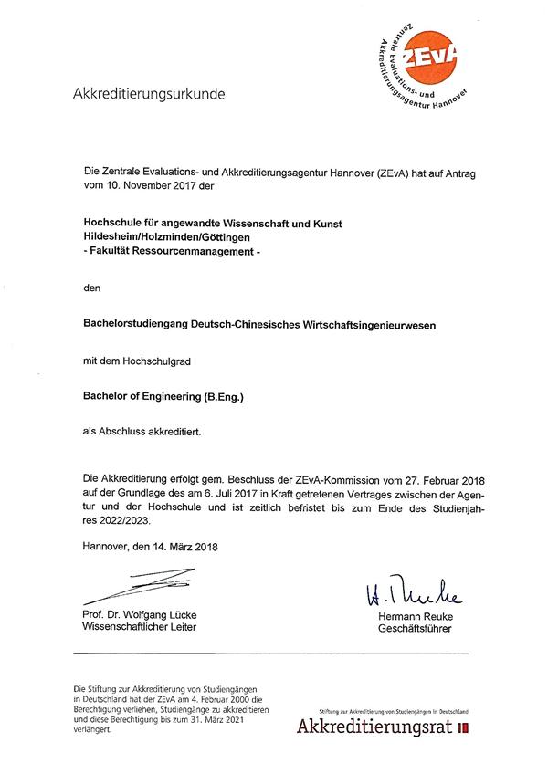 Am 14. M?rz 2018 akkreditierte die zentrale Evaluations- und Akkreditierungsagentur den Bachelorstudiengang ?Deutsch-Chinesisches Wirtschaftsingenieurwesen“, der den Studienabschluss ?Bachelor of Engineering“ vorsieht. Dieser Studiengang gilt als der erste von Deutschland akkreditierte Studiengang in der Provinz Anhui. Dies kann man als gro?en Erfolg der Zusammenarbeit zwischen der Universit?t Hefei und der Hochschule für angewandte Wissenschaft und Kunst Hildesheim/Holzminden/G?ttingen ansehen. Die Universit?t Hefei sieht es als Aufgabe an, den Studiengang weiterzuentwickeln und die deutsch-chinesische Zusammenarbeit auszubauen.