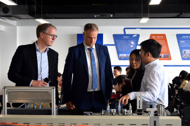王其東陪同亞歷山大·施梅曼一行深入能源材料與化工學院與大眾學院,調(diào)研先進電池關(guān)鍵材料與技術(shù)重點實驗室、大眾學院校企培訓中心與校企實訓中心、大眾學院產(chǎn)教融合平臺實驗室。