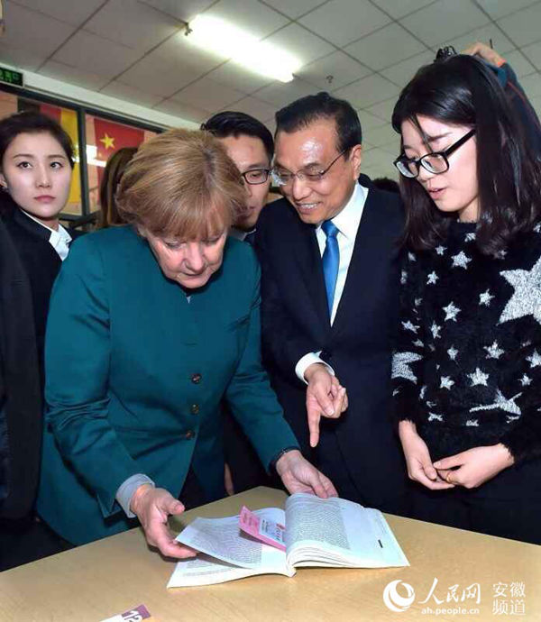 10月30日上午,合肥學院全體師生熱情高漲,校園內歡呼聲此起彼伏。國務院總理李克強與德國總理默克爾共同參觀了合肥學院。