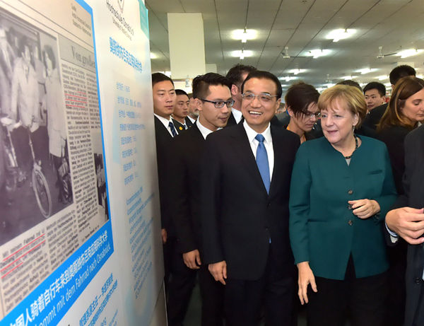 兩國總理饒有興致地觀看了中德合作共建合肥學院30周年的視頻和圖片展,李克強與默克爾同在場的中德兩國專家、師生和校友代表互動交流,參觀了學生自己設計并已投入市場的產品,在食品展區還品嘗了中德兩國學生合作釀制的啤酒,總理在與學生交流中鼓勵合肥學院學生好好學習,將來有所成就。