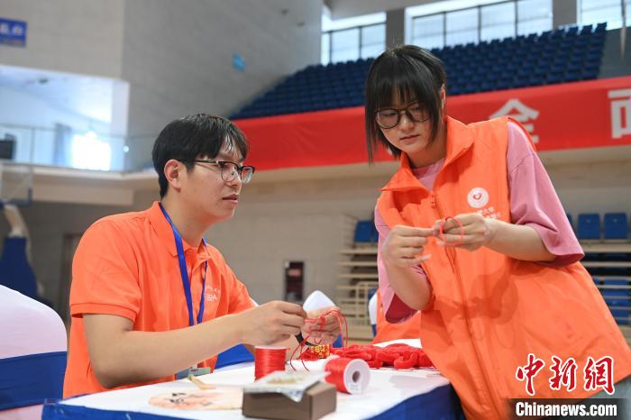 7月5日,在合肥大學(xué)南艷湖校區(qū),臺(tái)灣學(xué)生(左)在學(xué)習(xí)制作中國結(jié)。當(dāng)日,2024年皖臺(tái)青年交流活動(dòng)啟動(dòng)儀式暨臺(tái)灣大學(xué)生徽文化夏令營開營式在合肥舉行,來自臺(tái)灣的70余名青年師生走進(jìn)合肥大學(xué),體驗(yàn)傳統(tǒng)文化。