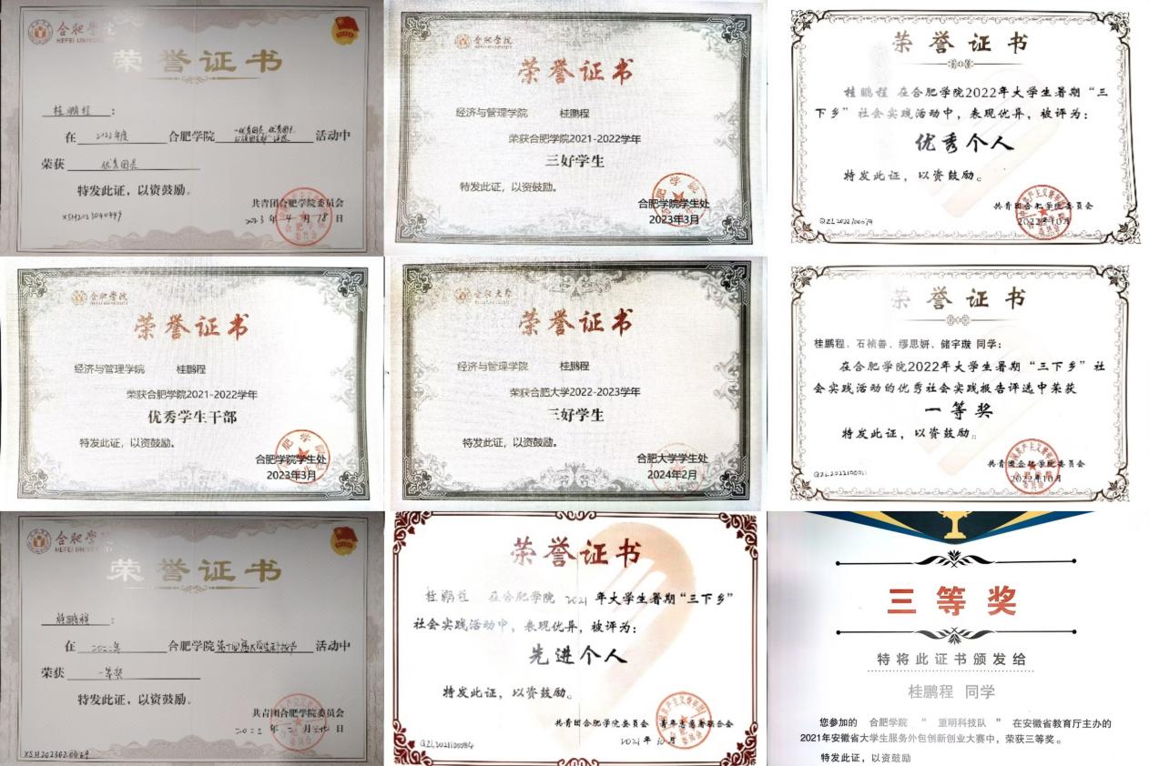 在大學期間,桂鵬程積極向團組織靠攏,在2022年度合肥學院“優秀團員、優秀團干、紅旗團支部”評選活動中,榮獲“優秀團員”稱號。學習上勤奮刻苦,班級管理中認真負責,多次獲評“三好學生”、“優秀學生干部”等榮譽稱號,以優異成績展現扎實的專業功底。