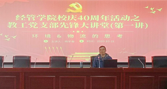 1021日,經管學院四十周年校慶活動之一教工黨支部先鋒大講堂(第一講)環境與物流專題在一區六棟報告廳舉行。經管學院黨委書記楊學春就當今環境變化對物流的啟示及未來物流發展趨勢進行了闡述。