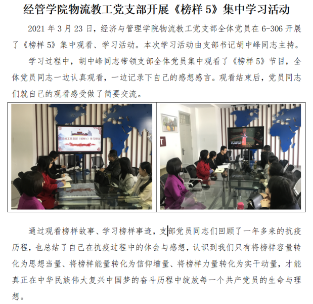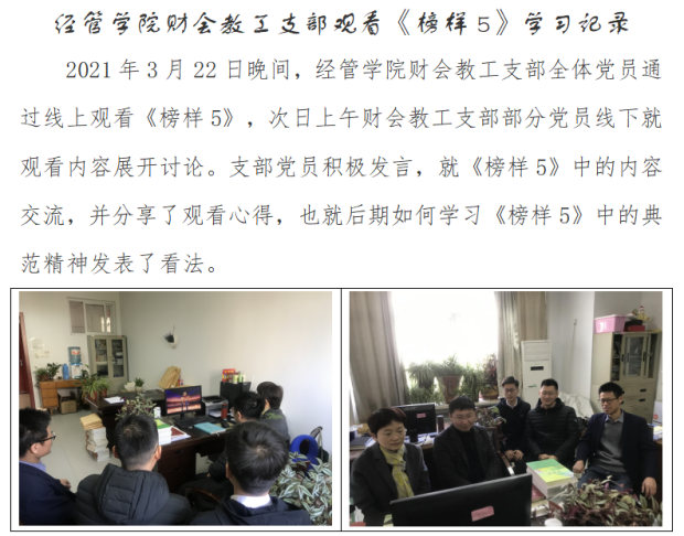 為深入學習貫徹習近平新時代中國特色社會主義思想,全面貫徹黨的十九大和十九屆四中、五中全會精神,充分發揮先進典型示范引領作用,鞏固深化“不忘初心、牢記使命”主題教育成果,2021年3月23日,經濟與管理學院各教工、學生黨支部積極響應學校、學院黨委號召,由各支部書記帶領,組織師生黨員觀看《榜樣5》。