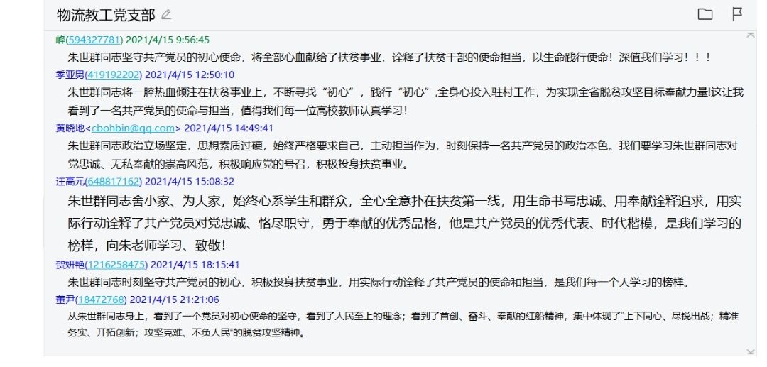 物流教工黨支部開展線下座談會,全體黨員教師懷著極其沉痛的心情觀看了安徽新聞聯播中關于對朱世群老師事跡的報道,對朱老師進行緬懷和深刻的悼念。投資金融黨支部,經貿支部黨員老師和財會教工黨支部在線上發起對朱世群同志的緬懷活動,并組織全體黨員積極學習其先進感人事跡。