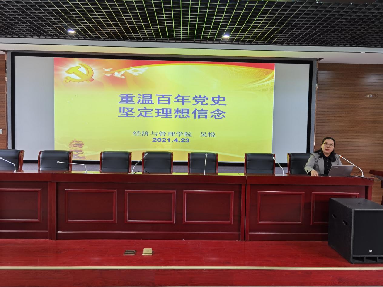 為慶祝中國共產(chǎn)黨百年誕辰,學(xué)習(xí)百年黨史輝煌歷程,20201年4月23日,經(jīng)濟(jì)與管理學(xué)院舉行教工黨支部先鋒大講堂系列第九講。此次大講堂由我院黨委委員、副院長吳悅擔(dān)任主講人,各支部學(xué)生黨員參與學(xué)習(xí)。