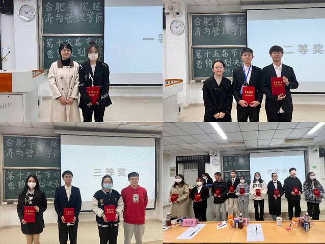 比賽伊始,主持人向大家簡(jiǎn)單介紹此次決賽的流程以及評(píng)分規(guī)則。本次比賽共15支隊(duì)伍參加,每組代表有5分鐘PPT講演時(shí)間,演講完畢,小組成員上臺(tái)進(jìn)行答辯。參賽隊(duì)伍通過(guò)賽前所搜集的材料向評(píng)委們介紹本隊(duì)所營(yíng)銷的產(chǎn)品,部分參賽小組還帶來(lái)視頻或表演,生動(dòng)形象地展示了產(chǎn)品的獨(dú)特優(yōu)勢(shì),為比賽增添更多趣味性。答辯環(huán)節(jié),評(píng)委們針對(duì)策劃書(shū)內(nèi)容和PPT講演對(duì)隊(duì)伍的三名代表進(jìn)行提問(wèn)。各組代表臨場(chǎng)不懼,對(duì)答如流,充分表達(dá)自身對(duì)問(wèn)題的見(jiàn)解和思路。張老師針對(duì)營(yíng)銷策劃書(shū)的邏輯性問(wèn)題提出質(zhì)詢,并對(duì)各組市場(chǎng)營(yíng)銷模型分析提出專業(yè)意見(jiàn)。劉老師從各個(gè)產(chǎn)品營(yíng)銷策略實(shí)施可行性角度展開(kāi)提問(wèn),考驗(yàn)答辯同學(xué)對(duì)產(chǎn)品的把握度。余老師則從生活實(shí)際出發(fā),對(duì)產(chǎn)品的用戶實(shí)際體驗(yàn)感提出不足之處。最后由張老師、劉老師、余老師、李智同學(xué)分別為獲得本次比賽一等獎(jiǎng)、二等獎(jiǎng)、三等獎(jiǎng)、優(yōu)秀獎(jiǎng)的參賽隊(duì)伍進(jìn)行頒獎(jiǎng)并合影留戀。