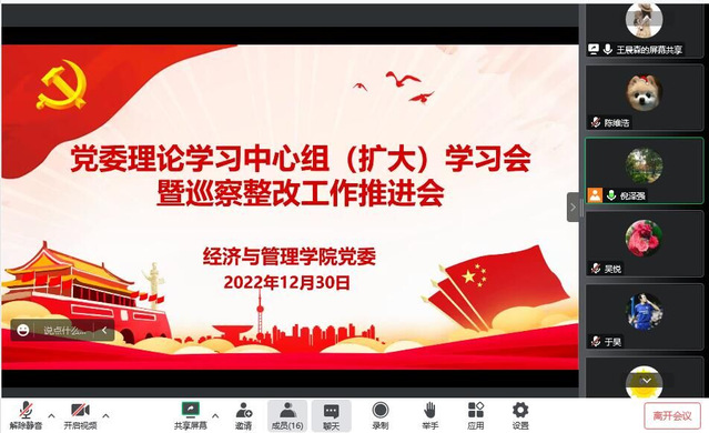 2022年1230上午經(jīng)濟(jì)與管理學(xué)院黨委理論學(xué)習(xí)中心組(擴(kuò)大)學(xué)習(xí)會暨巡察整改工作推進(jìn)會順利召開采用線上騰訊會議和線下會議相結(jié)合的方式會議由經(jīng)濟(jì)與管理學(xué)院黨委書記倪澤強(qiáng)主持,經(jīng)濟(jì)與管理學(xué)院院長陳江華、黨委委員、各黨支部書記參與會議。