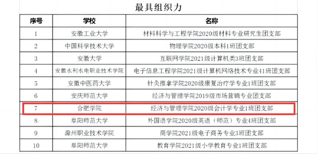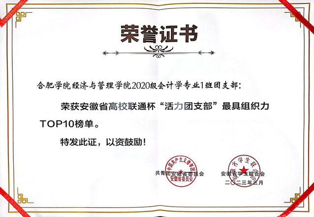 近日,在共青團安徽省委員會、安徽省學生聯合會主辦的2022年安徽省高校聯通杯“活力團支部”“活力社團”風采展示活動中,經濟與管理學院2020級會計學專業1班團支部榮獲安徽省高校聯通杯“活力團支部”最具組織力TOP10榜單,是我校唯一獲得此榮譽的班級團支部。