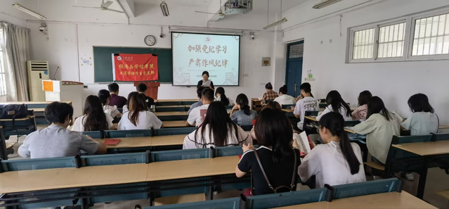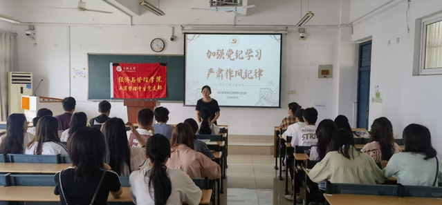 2024年6月7日經濟與管理學院工商管理學生黨支部在一期4棟301教室開展“加強黨紀學習,嚴肅作風紀律”主題黨課,支部書記姚璇老師帶領全體黨員學習《中國共產黨紀律處分條例》