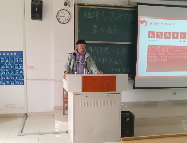 為加強對青年大學生的思想政治引領,著力為黨培養和輸送青年政治骨干,2024年3月13日經濟與管理學院第五期青年馬克思主義者培養工程第五講于一期校園五棟101室成功舉行。此次課程由經濟與管理學院團委主席支晨濤同學主講,第五屆團委學生會成員與23級新生班干參與學習。