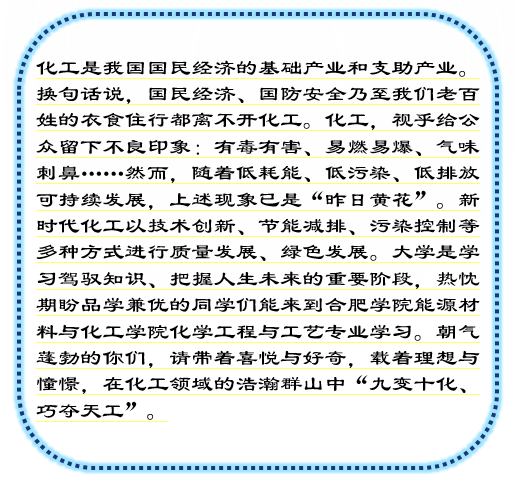 本專業立足安徽區域煤化工、鹽化工和石油化工以及衍生材料化工、精細化工、能源化工發展技術新趨勢,主動設置與產業鏈緊密對接專業方向和學科交融,構建了材料化工、節能技術、精細化工和化工分離4個專業方向,形成了專業特色。