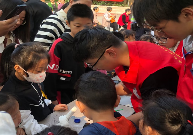 本次活動的首個環節是社區化學實驗。在本環節中,志愿者們通過從實驗室帶來的化學實驗裝置與試劑,向居民們簡單地展示了化學反應的基本原理和實驗過程,旨在讓大家在輕松愉快的氛圍中了解有關化學的知識。例如,團隊成員們使用靛藍二磺酸鈉、碘伏、維生素C等實驗試劑以及燒杯等裝置,為大家演示了變色碘伏實驗,配置碘酒溶液、著色、研磨維生素C并進行最終反應,實驗過程中不僅做到每一步都準確完成,更是在不停地講解每一步所發生的化學反應原理,為什么燒杯中的溶液顏色會不停地變換,用通俗易懂的語言生動形象地描繪了奇妙多彩的化學世界,通過精心設計的實驗項目,參與者將親身體驗化學反應的神奇魅力,增加了大家對科學的興趣和認識。居民們對此表現出濃厚的興趣,紛紛詢問和探究,志愿們也一一解答,使得居民們對化學實驗有了更深入的了解。
