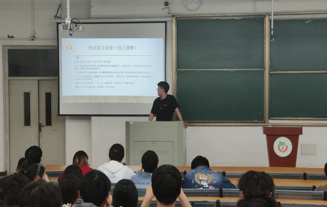 兩天后的4月18日,第二場考研交流會同樣在生化樓一階梯教室舉行。高分考取合肥工業大學的馮燕燕學姐強調了目標的重要性,考取東北大學的張朋沖學長分享了他的學習方法和規劃。考取華東理工大學的劉丙龍學長從院校選擇講起,提醒大家不要過于緊張或被外界干擾。最后,考取中國科學技術大學的趙前程學長則建議大家根據自己的能力合理分配時間,不要放棄。
