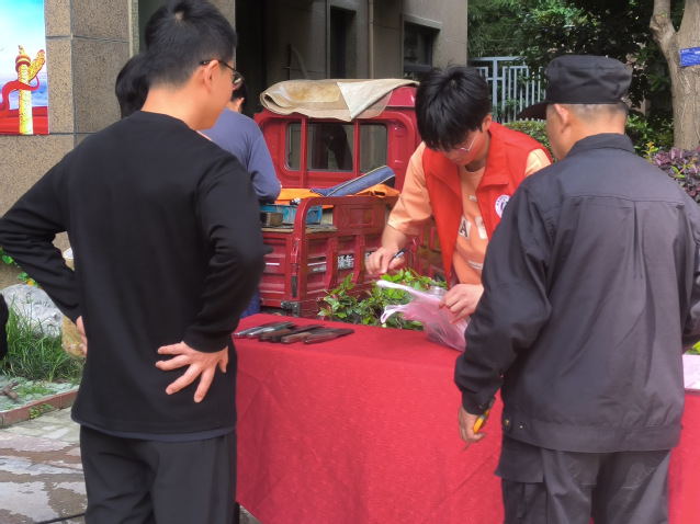便民服務中的磨刀師傅是最受居民們喜歡,從早上8到中午11點師傅一刻都沒有停下來,志愿者幫助前來需要磨刀的居民們將刀寫上門牌號,以防拿錯。轄區居民們一邊等著磨刀,一邊饒有興致的討論磨刀訣竅